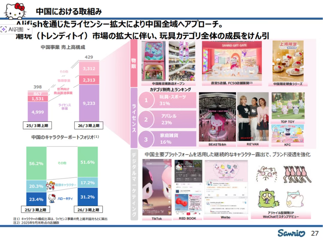财报数据同样亮眼:坐拥Hello Kitty的三丽鸥,2025年前三季度中国子公司总销售额达9.25亿元,同比大增82%,占亚洲区总销售额的68%,较 2022年同期增长四倍。其中,授权业务占总收入六成,玩具品类占据授权收入的31%,其次是服饰23%和杂货16%。